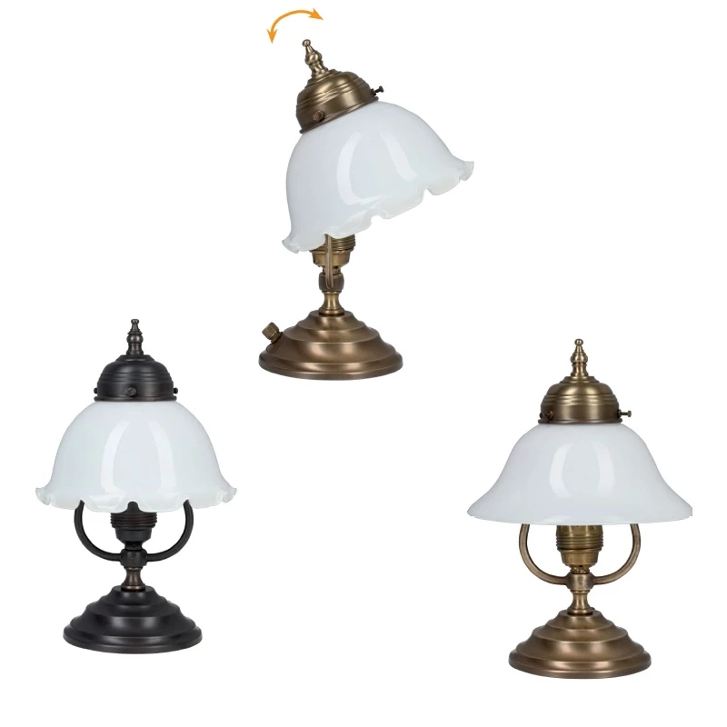 Einer original Vorlage aus dem 1900 Jahrhundert nachempfunden begeistert diese kleine Tischleuchte als stimmungsvolles Akzentlicht auf Tischen und Kommoden. Der Glasschirm aus mundgeblasenem Opalglas ist in beide Richtungen schwenk- bar und ermöglicht so eine individuelle Lichtausrichtung.