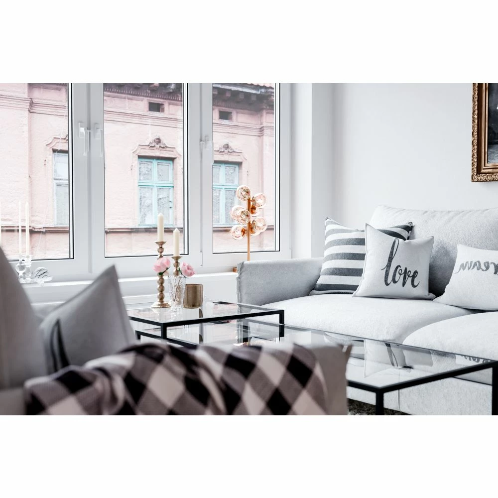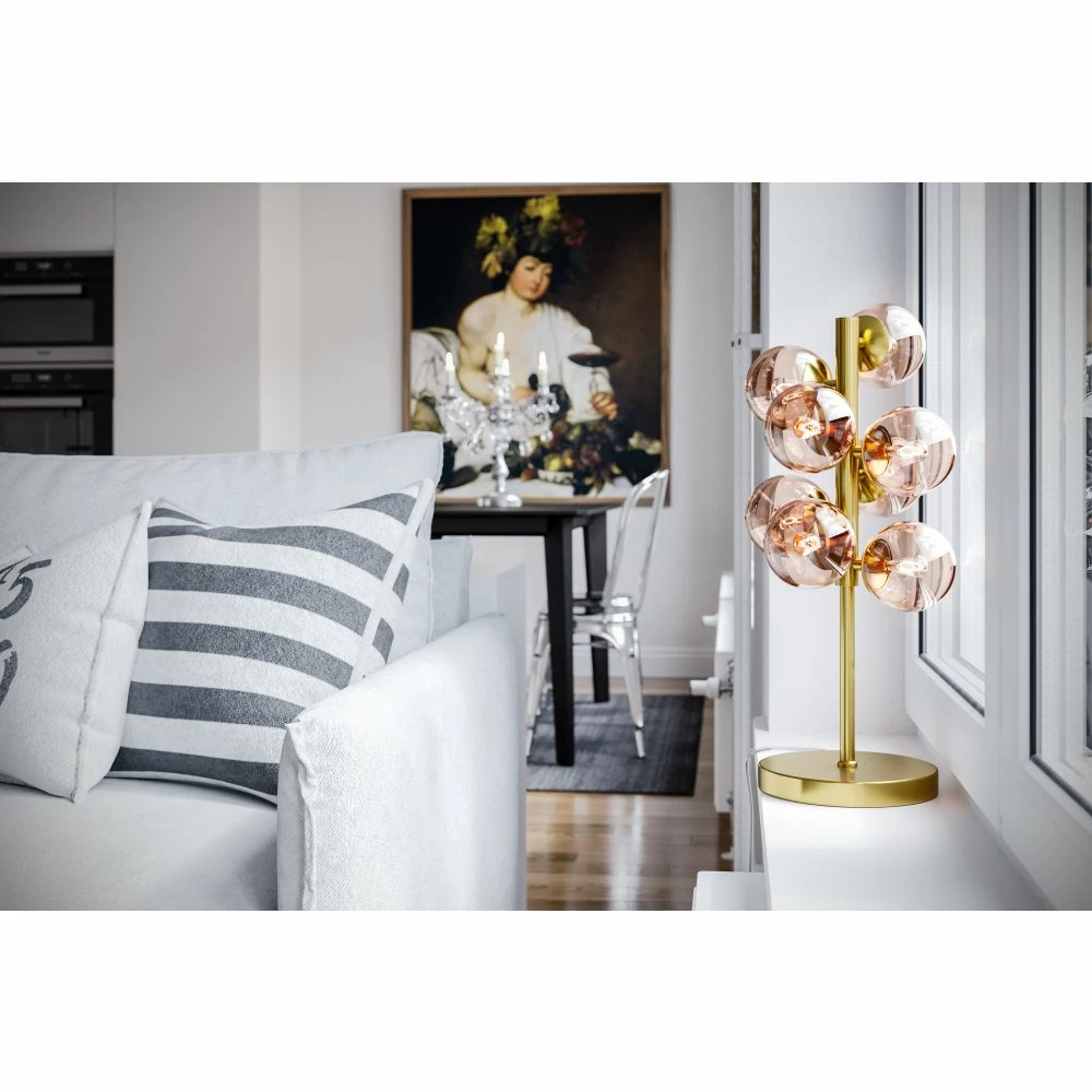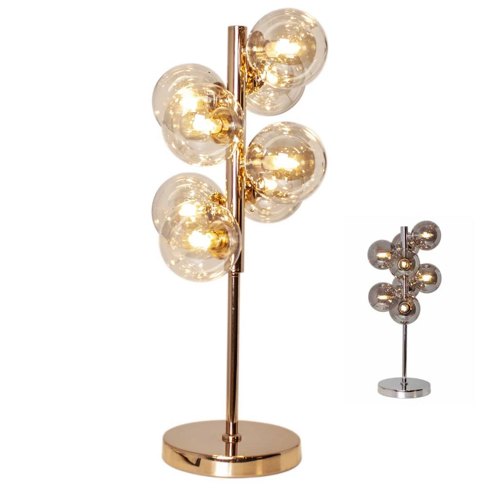 Diese Leuchte ist eine moderne und angesagte Tischlampe aus durchsichtigen, hübschen Glaskugeln, die in einer Reihe angebracht wurden. Die Lampe kann auf einer Fensterbank oder auf einem Sideboard platziert werden, wo sie als Blickfang wahrgenommen wird. Um das Potential Ihrer Lampe voll auszuschöpfen, haben wir uns dafür entschieden, einen Dimmer am Kabel anzubringen, damit Sie das Licht nach Ihren Wünschen und Ihrem Geschmack dimmen können. Die Tischlampe ist in zwei Farben erhältlich: Smoke und Amber. Die Tischlampe ist in zwei Farben erhältlich: Rauch und Bernstein. Smoke besticht mit rauchigem Glas auf einem verchromten Lampensockel, Amber mit bernsteinfarbenem Glas auf einem Messinglampensockel. Für beide Farbstellungen benötigen Sie 8 Glühbirnen mit G9-Fassungen. Vergessen Sie nicht, Glühbirnen in Ihren Warenkorb zu legen.