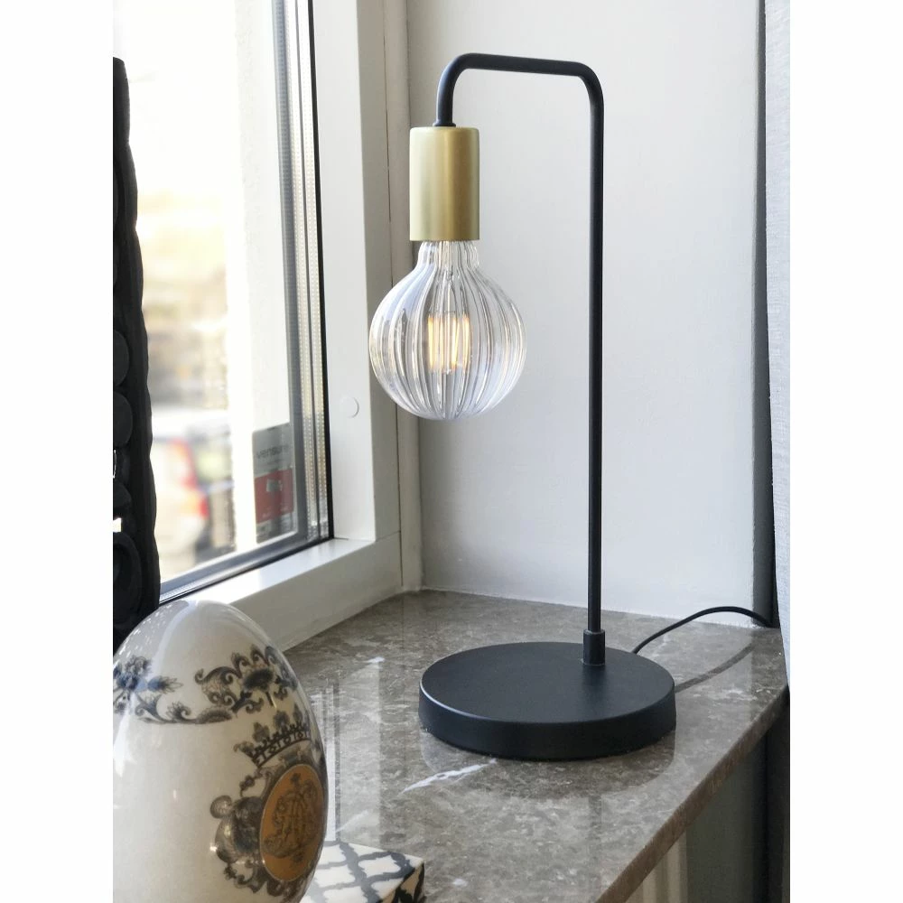 Diese Lampe ist eine schlichte, stilreine Tischleuchte aus schwarzem Metall. Der Lampenhalter aus mattem Messing hängt an dem oben rechtwinklig abgebogenen Ständer, wodurch das Licht nach unten gerichtet ist. Die Leuchte hat eine Höhe von 45 cm und erfordert das Einsetzen eines Leuchtmittels in geeigneter Größe.