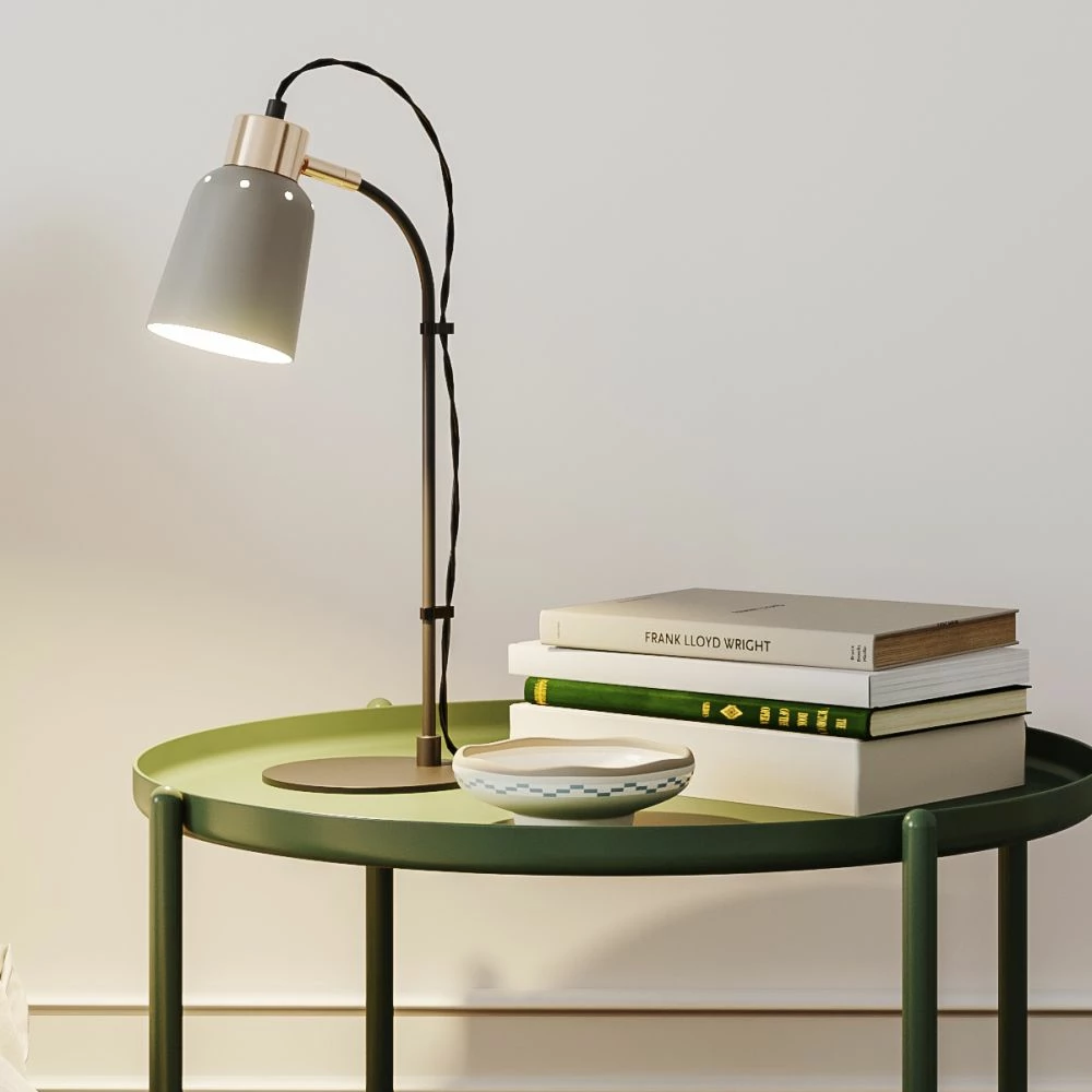 Die Tischlampe mit ihrem detailreichen, modernen Design macht sich besonders gut auf dem Schreibtisch / der Fensterbank. Schirm aus grau lackiertem Metall mit goldenen Details und einem schwarz lackierten Fuß. Das graue, verdrehte Textilkabel verleiht der Lampe das gewisse Extra. Die Serie umfasst auch eine Deckenleuchte, Stehleuchte und Wandleuchte.
