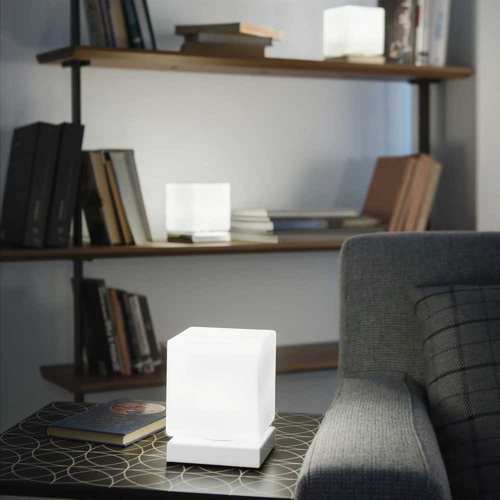 Die würfelförmige Tischleuchte ist mit einem 6 Watt LED-Leuchtmittel ausgestattet. Verdeckt von dem weißen Glas geht warmweißes, blendfreies Licht von der Lampe aus.