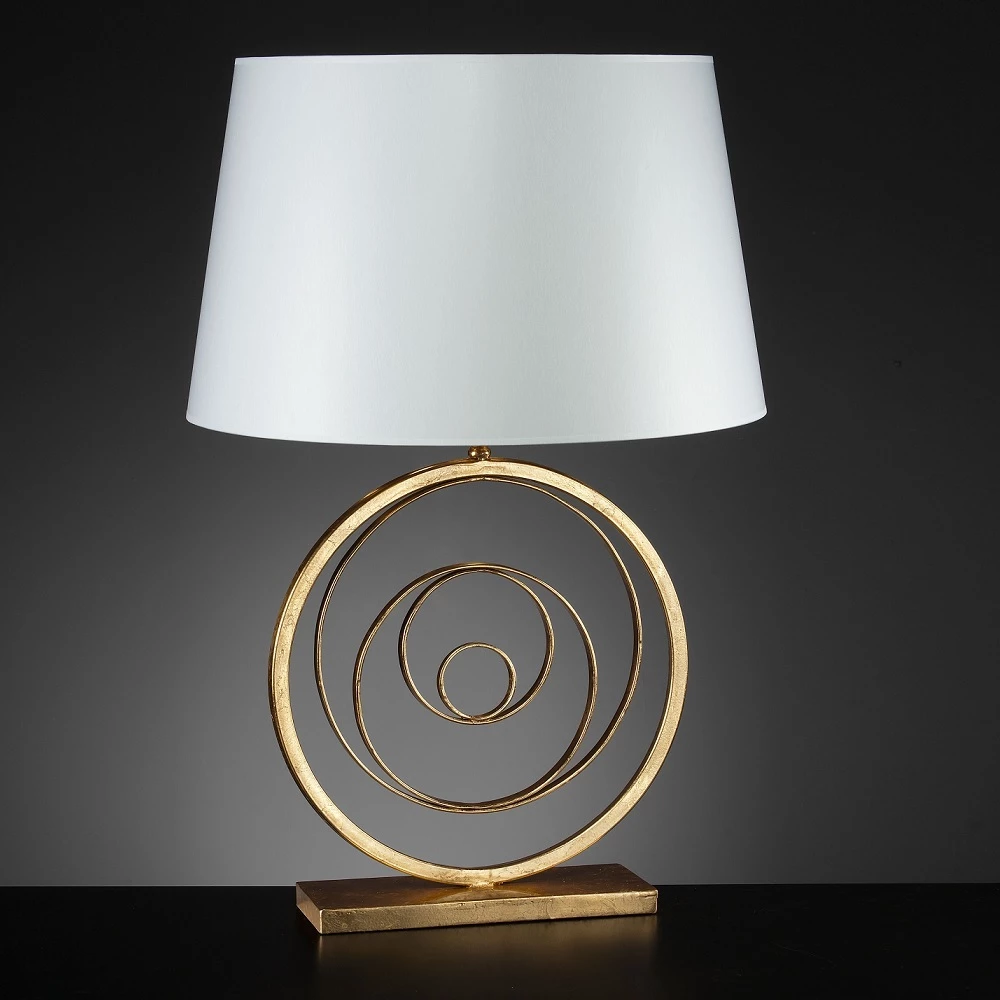 Der Leuchtenständer aus diversen, unterschiedlich großen Ringen trägt den Stofflampenschirm in Weiß, innen gold. Die Kombination aus weißem Stoff und dem Leuchtenfuß in Blattgold ist edel und sorgt für eleganten Komfort.