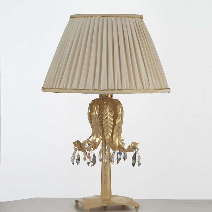Die Tischleuchte präsentiert sich edel und warmherzig. Wie ein Relikt aus einer anderen Zeit verbreitet sie sowohl in privaten als auch gewerblichen Interieurs ihren Charme. Die kunstvoll gearbeiteten schmalen Blätter umschließen den Leuchtenständer, dessen Oberfläche in edlem Blattgold gestaltet ist und mit einer weißen Patina versehen wurde. So entsteht der antike Charakter der Leuchte. Fein geschliffene Prismen aus Kristallglas runden das funkelnde Gesamtwerk ab und brechen das Licht auf einzigartige Art und Weise.