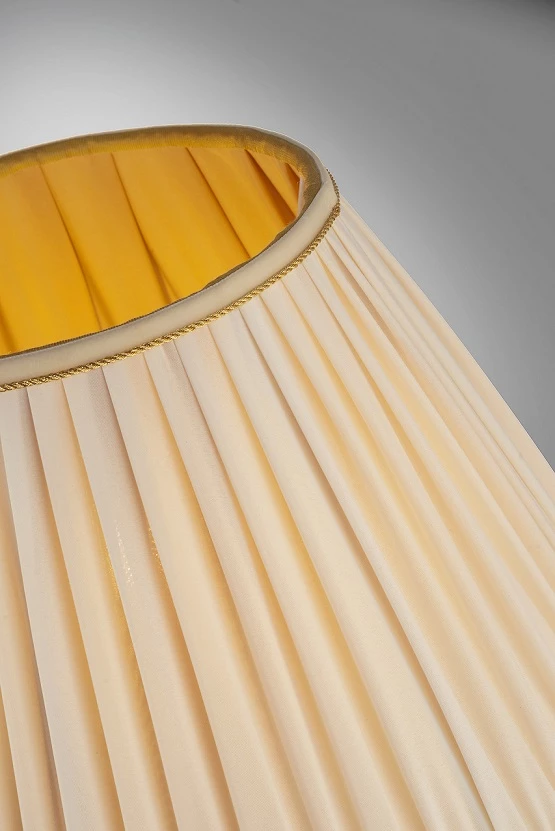 Der Lampenschirm aus plissiertem Stoff ist farblich harmonisch abgestimmt. Hier wurde sich für einen warmen Beigeton entschieden, der mit einer Goldkordel eingefasst ist.