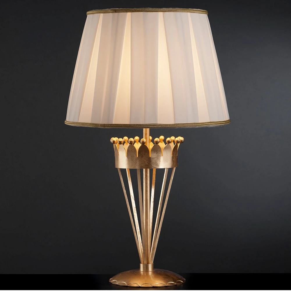 Der Leuchtenständer begeistert in Blattgold und kreativem Design. Nach oben öffnet sich dieser und wird zu einer Krone, die den Lampenschirm aus Stoff trägt. Der schöne, weiße Plissee-Stoff ist an den Rändern mit einer edlen Goldbordüre eingefasst und vervollständigt die hoheitsvolle Aussage dieser Leuchte.