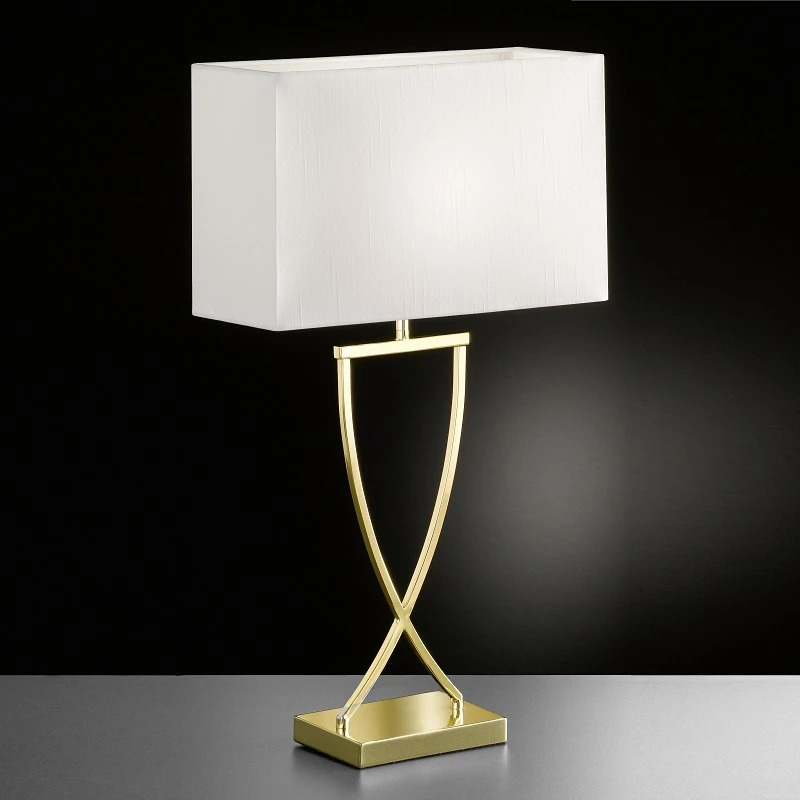 Das Gestell der Leuchte ist aus veredeltem Metall in der Farbe Messing-poliert hergestellt worden. Aus dem viereckigen Standfuß ragen zwei leicht gebogene Streben auf, welche die Halterung des Schirmes bilden. Die Tischleuchte ist im klassischen Design gehalten und eignet sich vor allem für den klassisch-zeitlosen Einrichtungsstil.