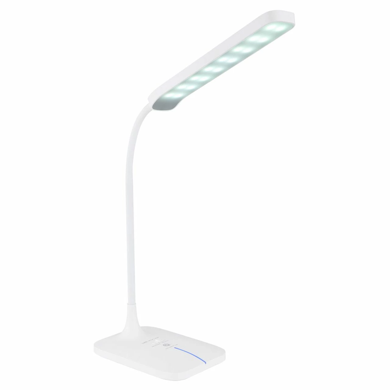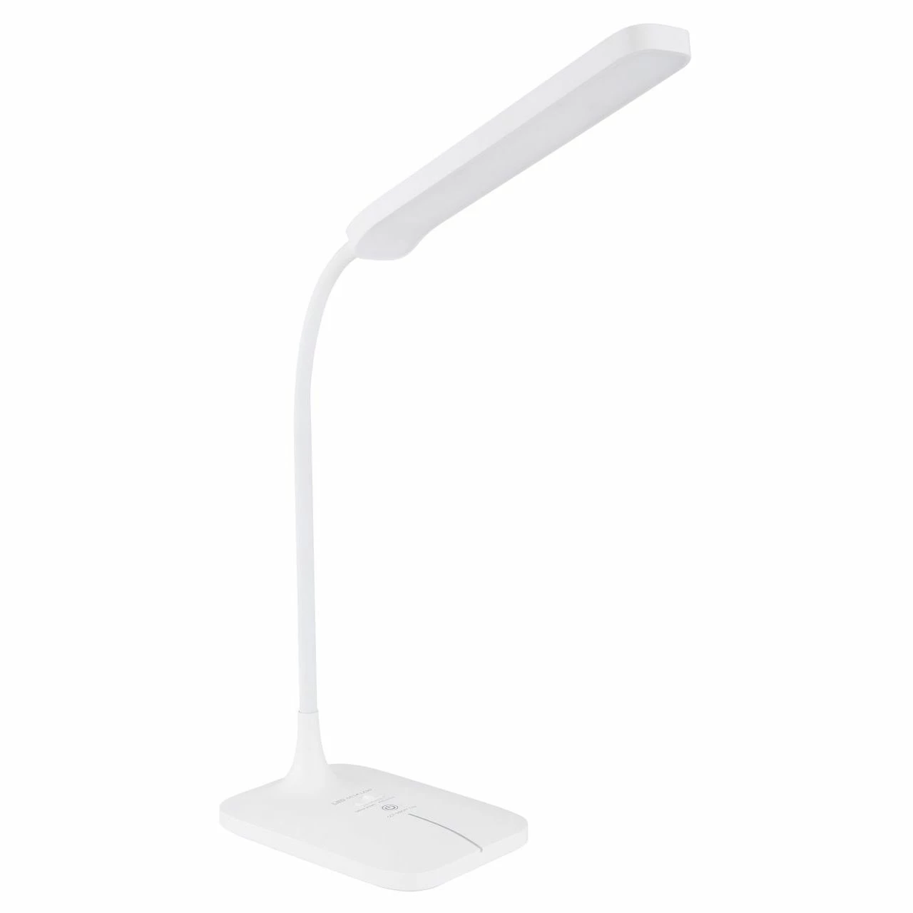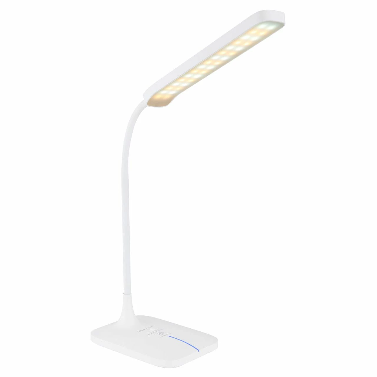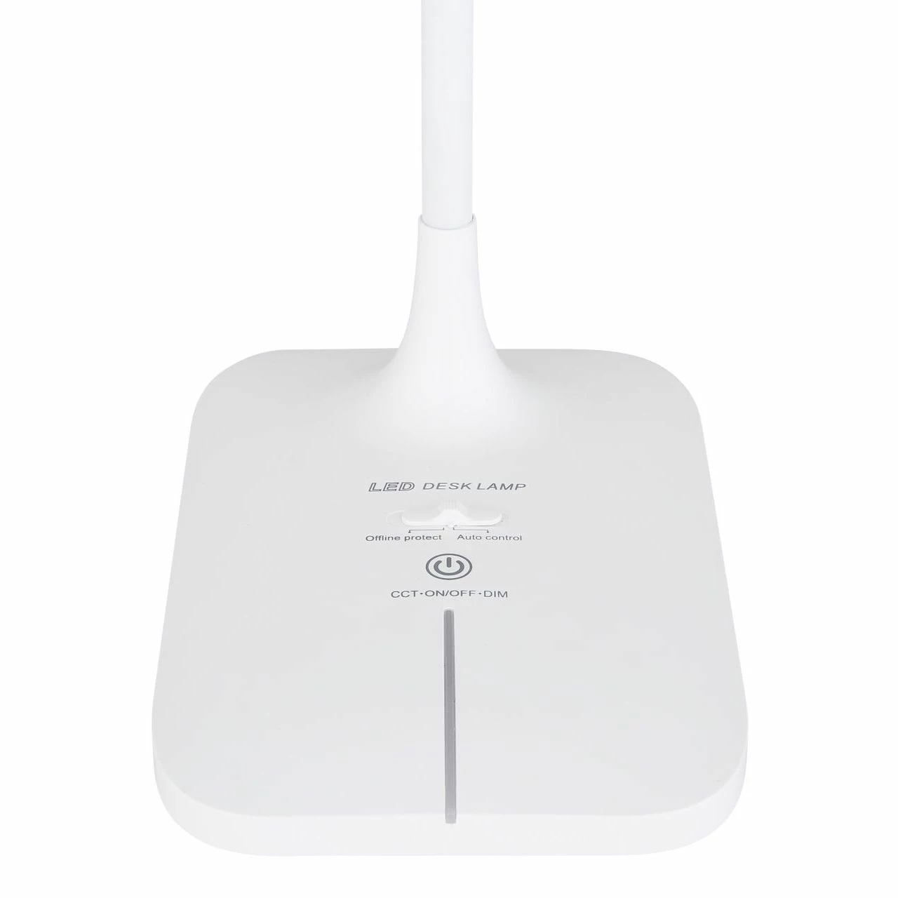 Die weiße Tischlampe aus Kunststoff mit opal Abdeckung hat einen rechteckigen Sockel und kann flexibel eingestellt werden. Über das mitgelieferte USB Kabel wird der Akku geladen, damit die Lampe unabhängig von Stockdosen im Büro, Schlaf-, Kinder-, Wohn- oder Esszimmer mit bis zu 300 Lumen leuchten kann. Die Helligkeit kann über den Touchdimmer reguliert werden, auch die Lichtfarbe kann zwischen 3000 Kelvin (warmweiß), 4000 Kelvin (neutralweiß) oder 6000 Kelvin (kaltweiß) eingestellt werden. Die 69 cm hohe, 12,8 cm breite und 43 cm lange Tischleuchte wird über einen Touchschalter ein- oder ausgeschalten und verbindet Funktionalität mit Design.