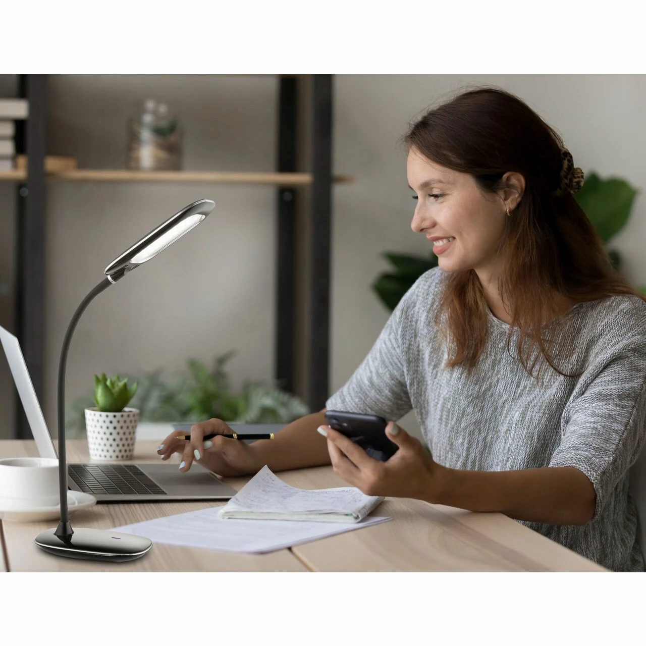 Bei dieser Tischlampe handelt es sich um eine schlichte und qualitative Leuchte, aus der Serie, die sich durch ihre Qualität auszeichnet. Bei der Anfertigung dieser Schreibtischlampe wurde ein schöner Kunststoff in Schwarz und Chrom gewählt, welcher diese Lampe in ihrer Optik einzigartig macht. Der Spot setzt einen eleganten Akzent, ist verstellbar und dient somit einer individuellen Benutzung. Ebenfalls ist ein Touchdimmer vorhanden, der für die Regulation der Helligkeit zur Verfügung steht. Eine 5 Watt starke LED sorgt für die richtige Helligkeit, die Lichtfarbe von 5500K wird als Kaltweiß empfunden und die Lichtstärke von 280 Lumen wurde perfekt dazu abgestimmt. Ebenfalls lässt sich dieser Artikel sehr gut mit weiteren Produkten aus der gleichen Serie kombinieren.