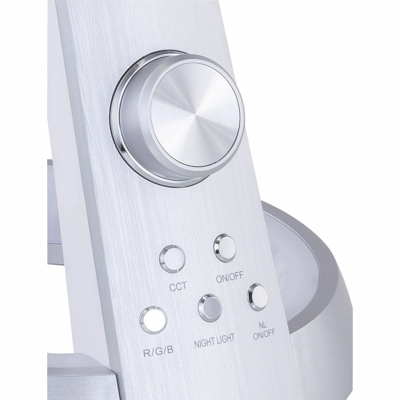 Die Tischleuchte aus silberfärbigen Kunststoff ist ein Modell für Jung und Alt. Hochwertig verarbeitet, ausgestattet mit einem Flexoarm, einem Farbwechsler, einer Touchfunktion und die Möglichkeit Farben zu fixieren – lässt dieser Hingucker wohl keinerlei Wünsche offen. Dank des inkludierten 8 Watt LED Leuchtmittels leistet diese dimmbare Tischlampe maximal 450 Lumen starkes Licht bei einer Lichtstärke von warm-weißen 3000 Kelvin, neutralweißen 4300 Kelvin oder kalten 6300 Kelvin. Die Lichtfarbe lässt sich unterschiedlich einstellen bzw. fixieren. Die Besonderheit dieser Tischlampe ist der auffällige Sockel, der durch das integrierte 2 Watt LED RGB Leuchtmittel in unterschiedlichen Farben leuchten kann. Somit kann diese Tischleuchte auch hervorragend als Nachtlicht verwendet werden.