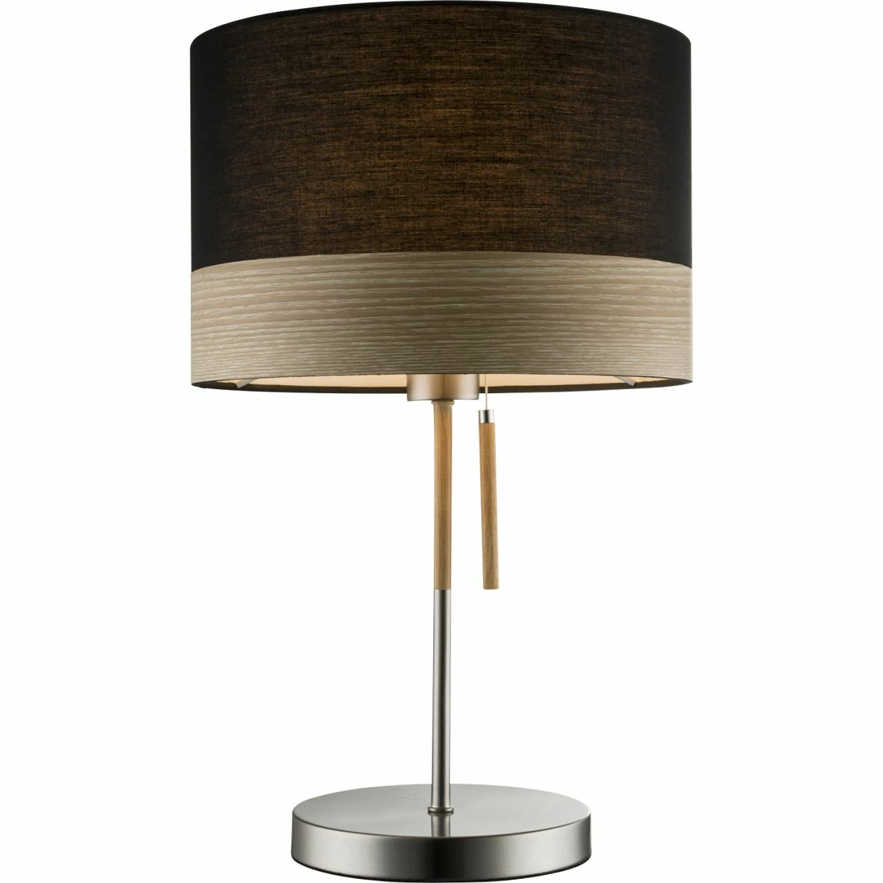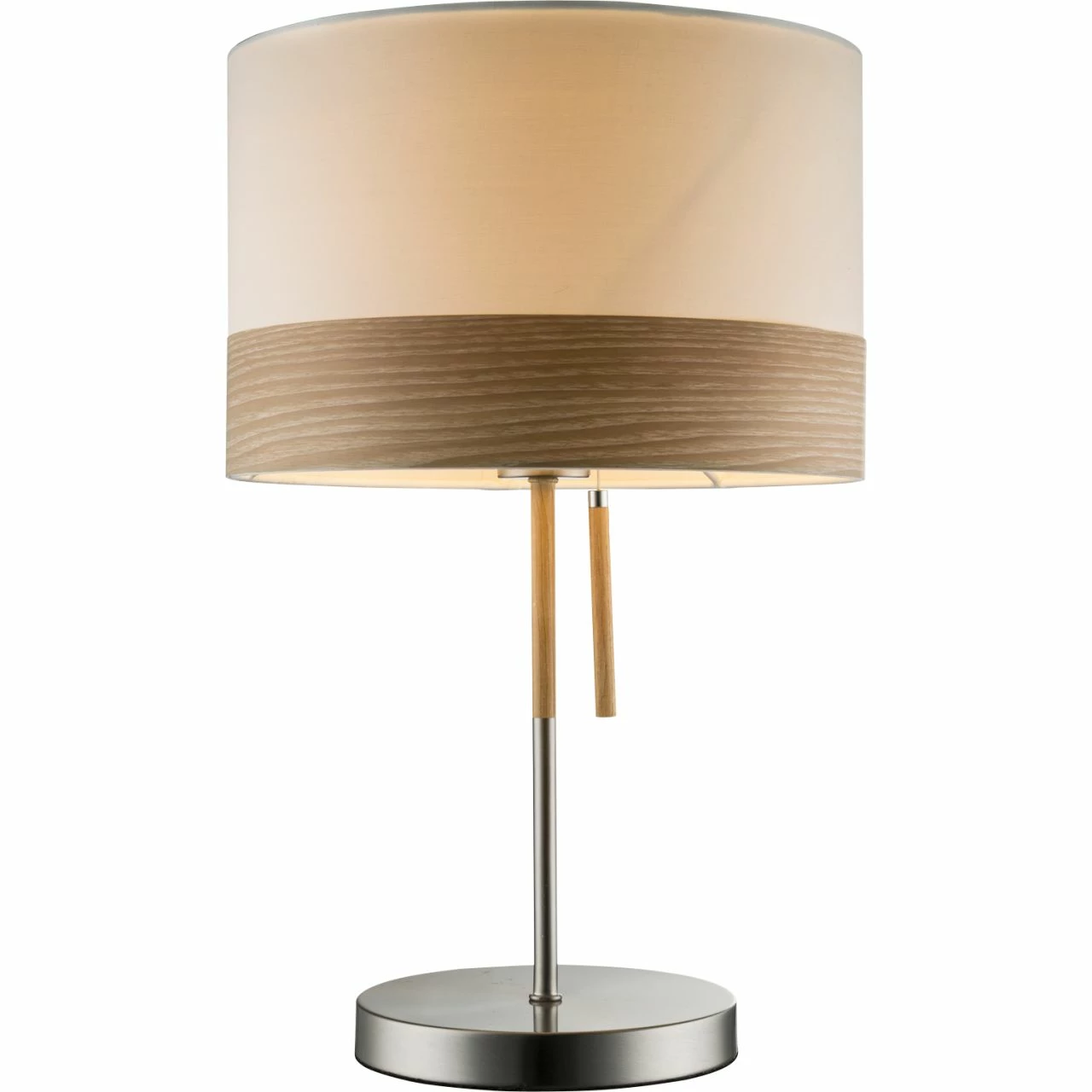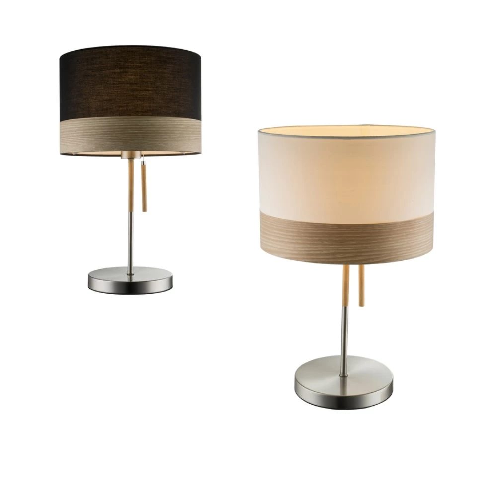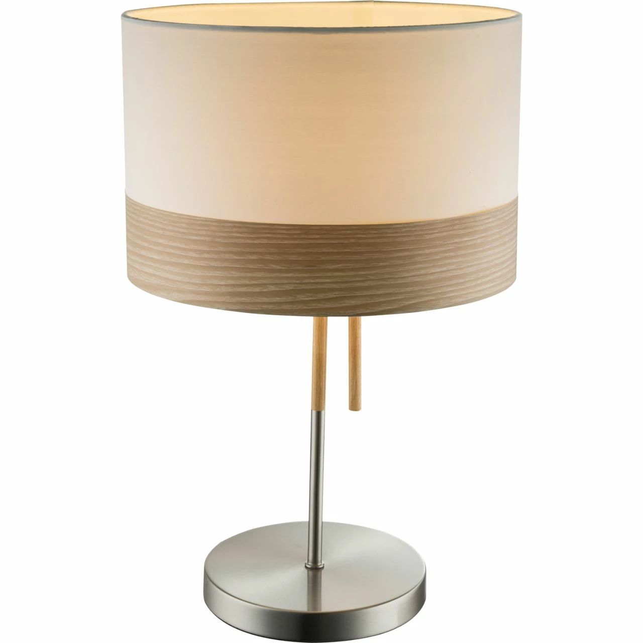 Mit Zugschalter und 40cm Durchmesser – Tischleuchte Chipsy mit Holzfurnier und Stoff in beige oder schwarz