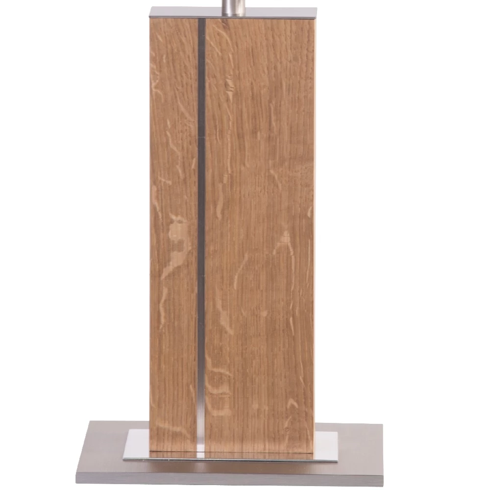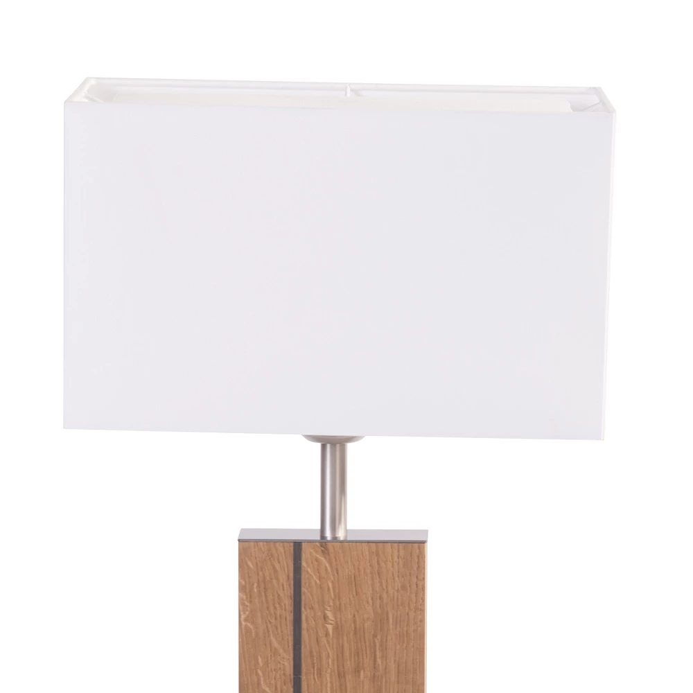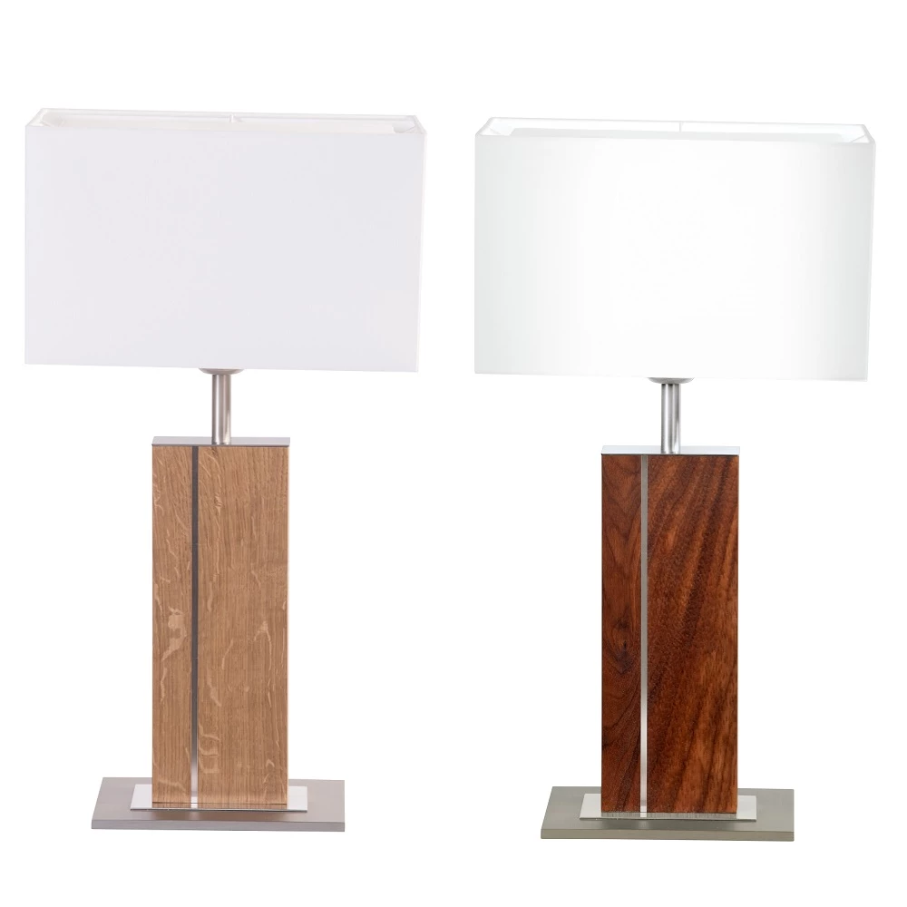 Die Tischlampe ist als Massivholz gefertigt und in Eiche oder Nussbaum geölt lieferbar. Ein weißer, eckiger Schirm aus Baumwolle ist mit beiden Ausführungen kombiniert. Mit Nickel-matten Metallelementen werden Akzente gesetzt und das Design harmonisch abgerundet.
