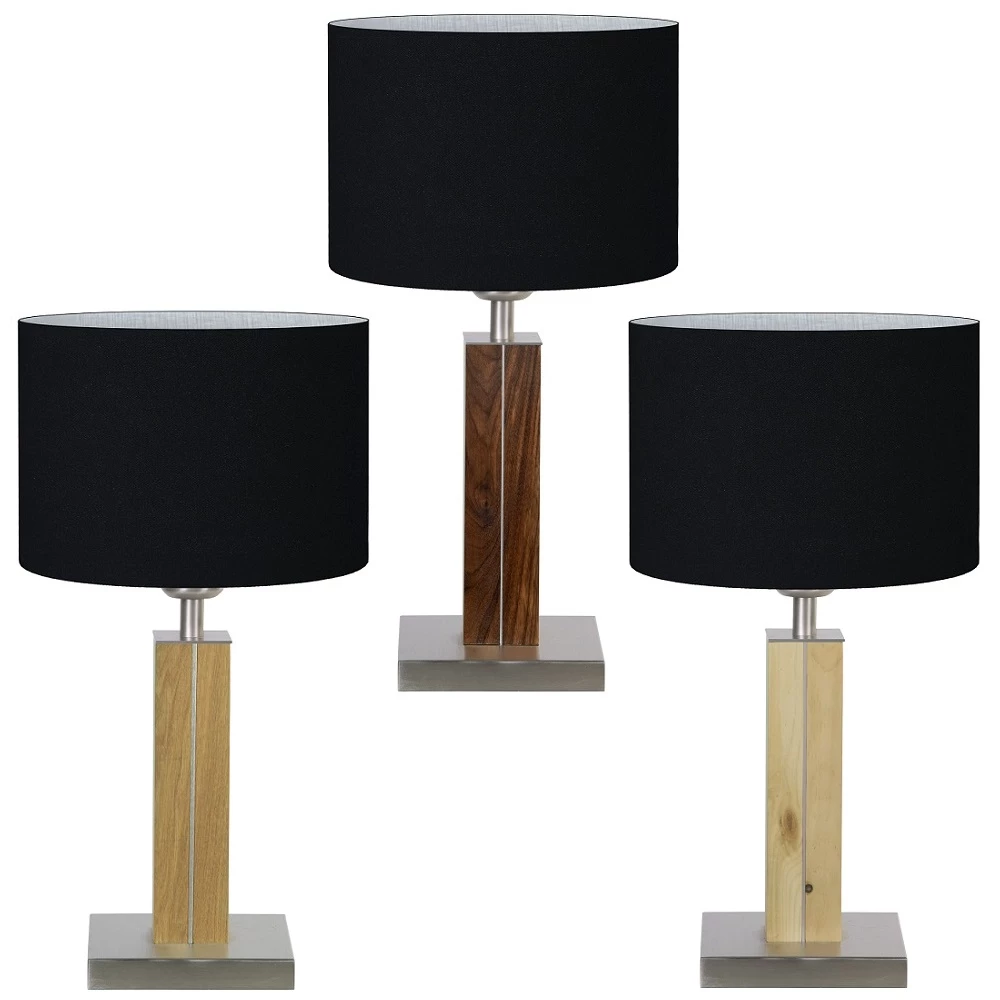 Die Tischleuchte vereint Formen und Materialien. So ist das Bein aus massivem Holz, wahlweise in Asteiche, Nussbaum oder Zirbenholz, gefertigt. Ein dünner Metallstreifen zieht sich vom eckigen Metallfuß zur Fassung. Alle Metallelemente sind Nickel-matt. Ein runder Schirm aus Baumwolle vollendet das Design. Der Schirm ist außen schwarz und innen silber.