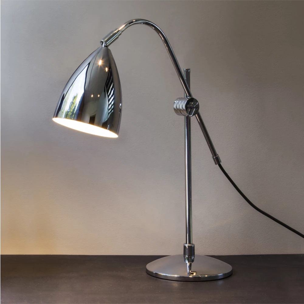 Die Tischlampe besticht durch ihr Bogenförmiges Design und kann wunschgemäß geneigt werden.