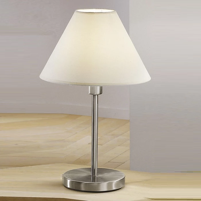 Gestaltet wurde die Tischlampe aus einem Leuchtenfuß in Nickel und einem dezent weißen Stoff- schirm. Mit einer Höhe von 21cm verbirgt der Schirm eine E27-Fassung für maximal 60W. Durch den Stoff ist der Lichtschein angenehm blendfrei, für eine entspannte Lichtatmosphäre.