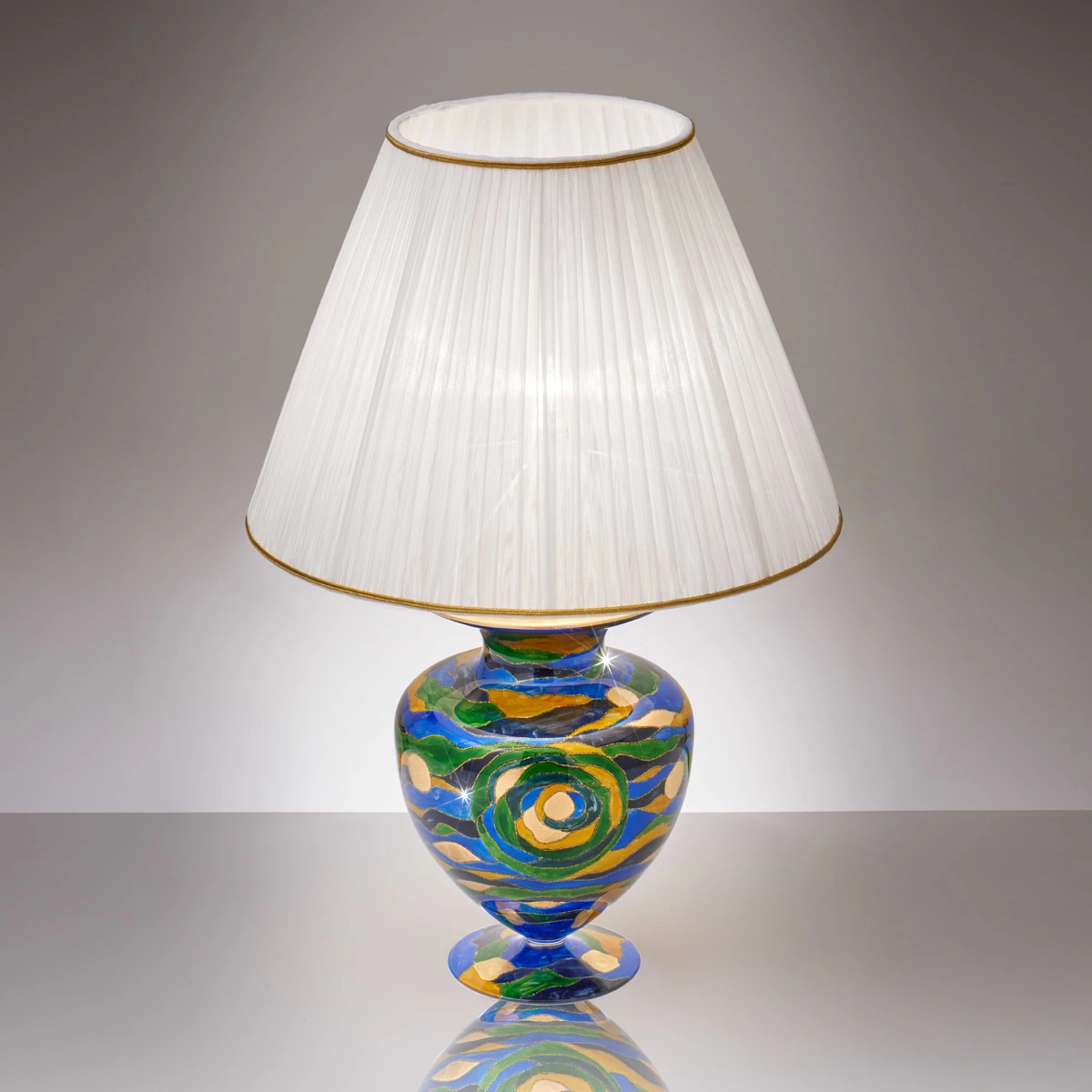 Inspiriert von antiken Amphoren ist unsere Tischleuchte Anfora. Ein Design von zeitloser Schönheit und Handmalerei mit Liebe zum Detail. Faszinierender Blickfang ist dieser prachtvolle Flow von Farben und Formen in jedem Raum.