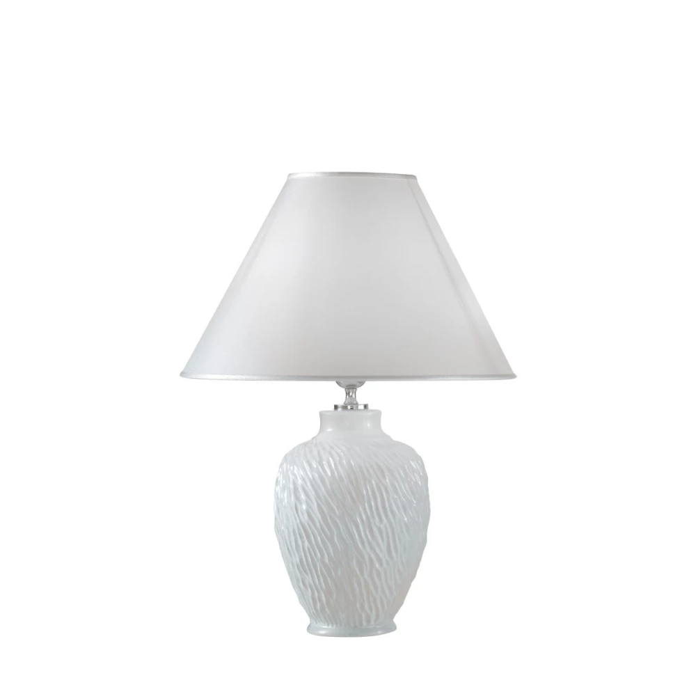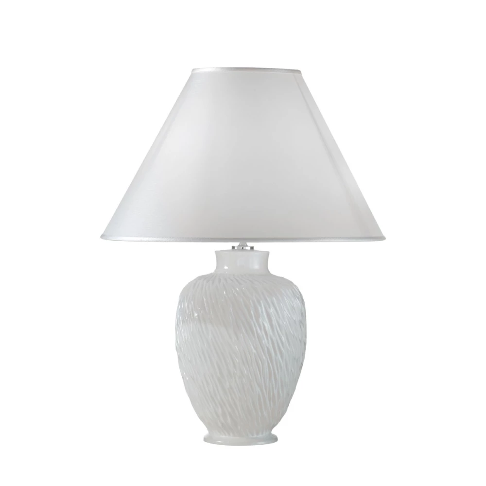 Ein schneeweißer Stoffschirm in geradliniger Kegelform und ein weißer Keramik-Sockel in dynamischer Relief-Optik – die komplett in Weiß gefertigte Tischleuchte ist ein wahres Schmuckstück.