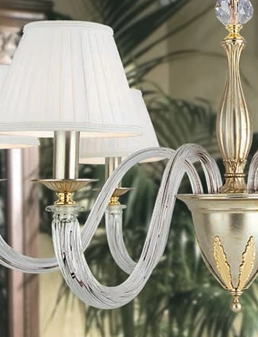 Die Oberfläche mit 24 K Gold veredelt findet sich auch in der Silber-antiken Variante wieder. Der kunstvoll geformte Leuchtenkörper findet seinen Mittelpunkt in bauchigem Kristallglas und endet in einem Lampenschirm aus Plisse-Stoff.