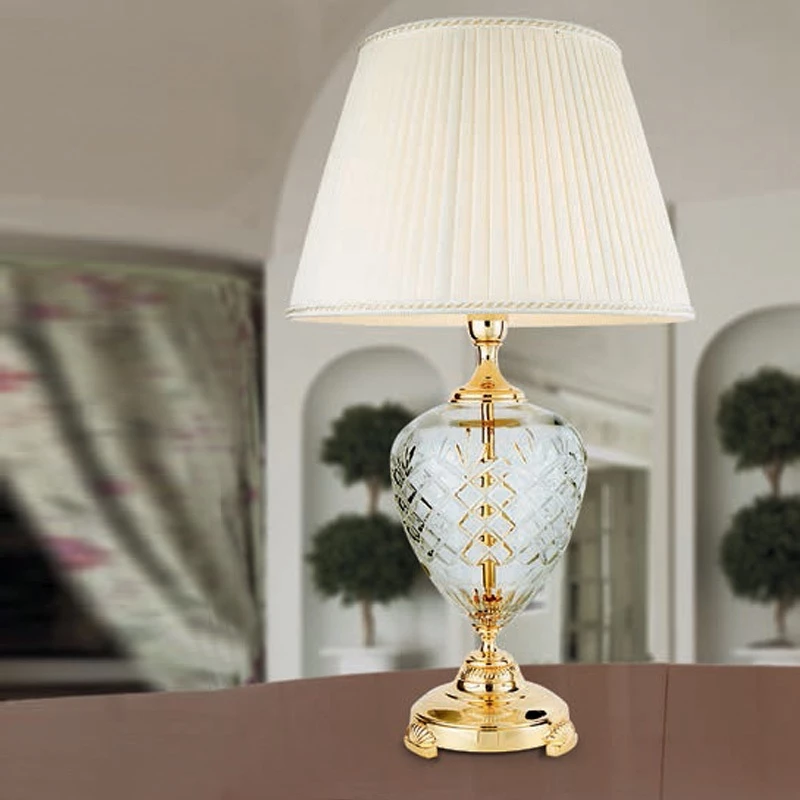 Klassische Tischleuchte mit edler Aussage in Gold 24 K oder Silber-antik/Gold 24K, Kristallglas und Stofflampenschirm.