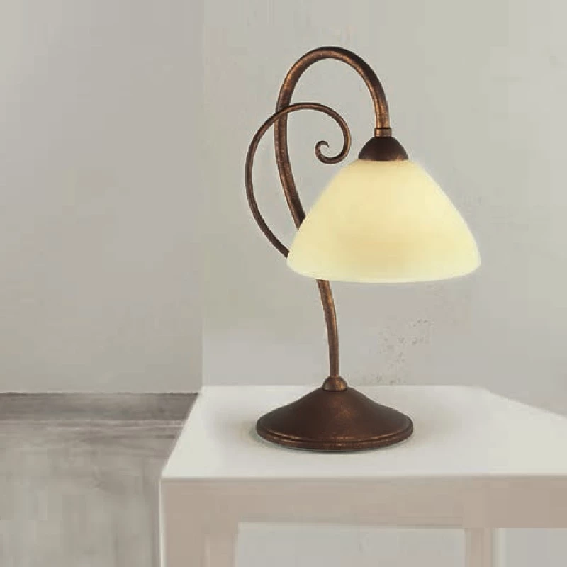 Die Metallelemente der Leuchten sind in Antik-Braun gestaltet und harmonieren mit cremefarbigen, satinierten Gläsern, die für einen blendfreien, warmen Lichtschein sorgen.
