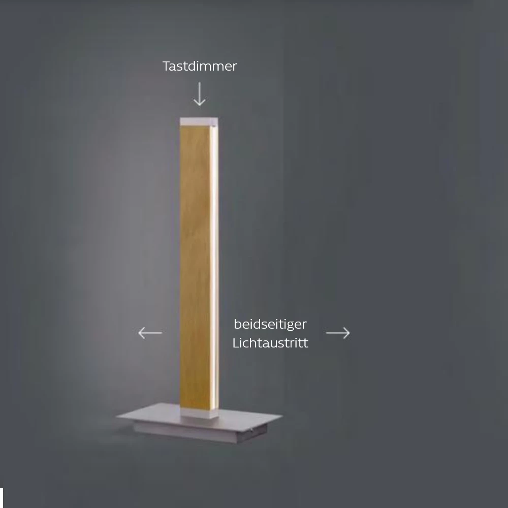 Die Leuchte wird inklusive 2×15W festverbauter LEDs geliefert, die Lichtfarbe ist angenehm warmweiß. Über den Tastdimmer direkt oben auf der Leuchte, können Sie die Helligkeit situationsgerecht anpassen.