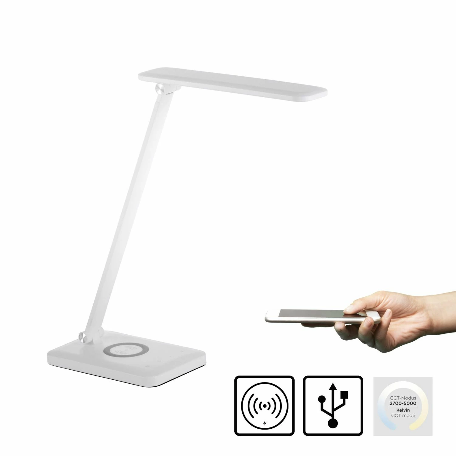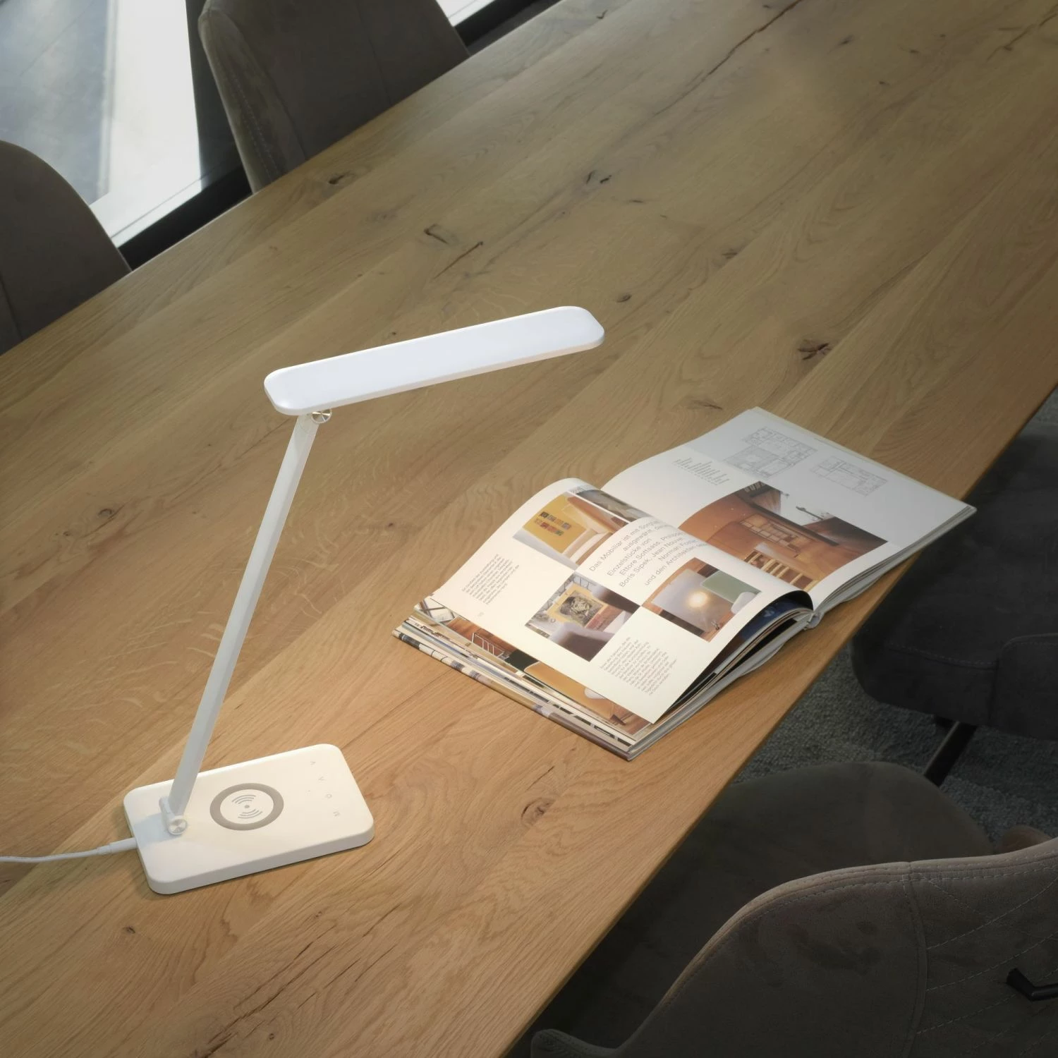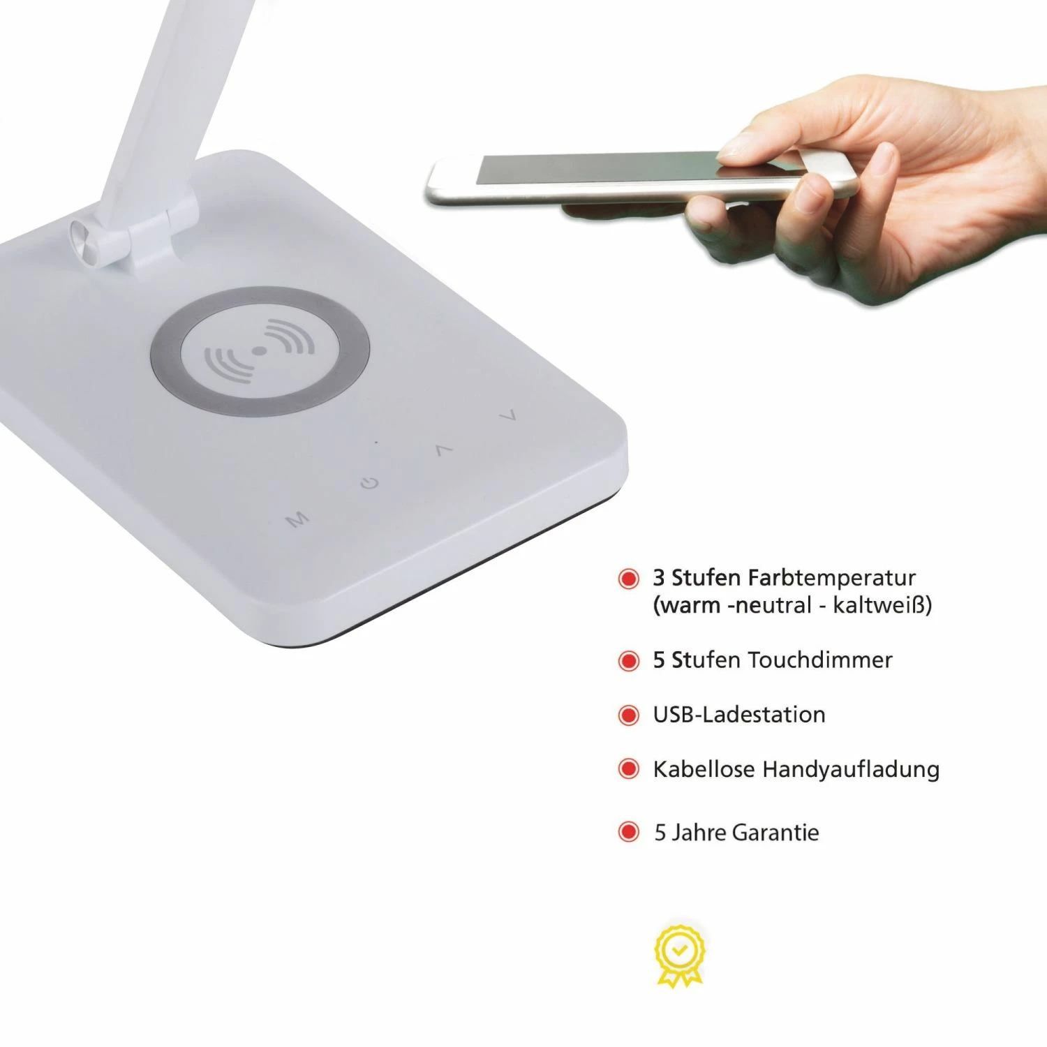 Die weiße LED Tischleuchte ist ein vielseitiger Wegbegleiter. Ganz gleich ob man die Tischlampe als Schreibtischleuchte oder Nachttischlampe verwendet, die Lichtquelle erfüllt absolut Ihren Zweck. Ausgestattet mit einem festverbauten LED Leuchtmittel kann man diese in 3-Stufen in der Farbtemperatur von warmweiß bis tageslichtweiß verstellen. Über einen Touchdimmer kann man auch die Lichtstärke in fünf verschiedenen Stufen verändern. Die Leuchte Ist höhenverstellbar und kann so ganz bequem den persönlichen Bedürfnissen angepasst werden. Zusätzlich verfügt die Lampe über eine Ladestation für Mobiltelefone, die man hier per USB oder sogar kabellos durch Auflegen des Telefons laden kann. Lassen Sie die LED Tischlampe in Ihre vier Wände einziehen und überzeugen sich von der tollen Funktionalität.