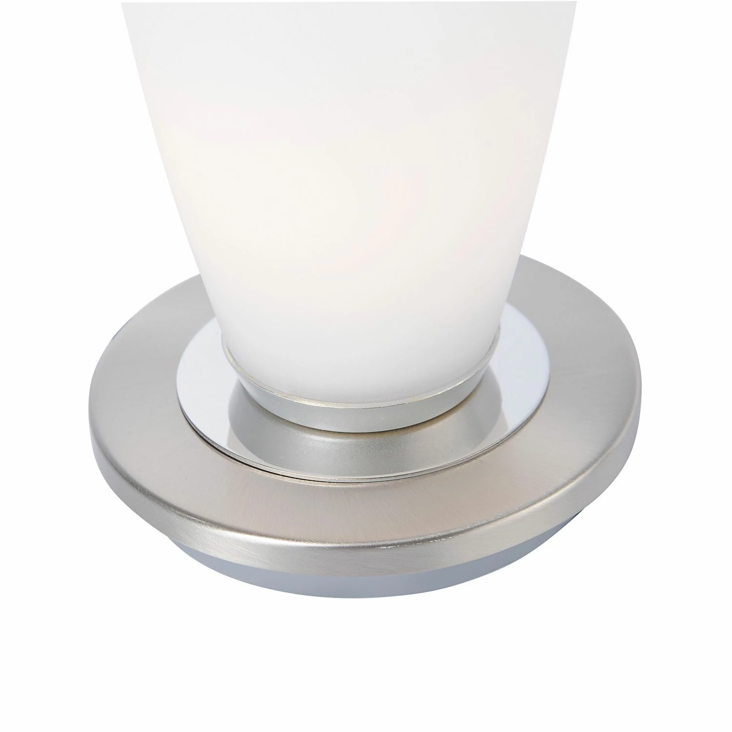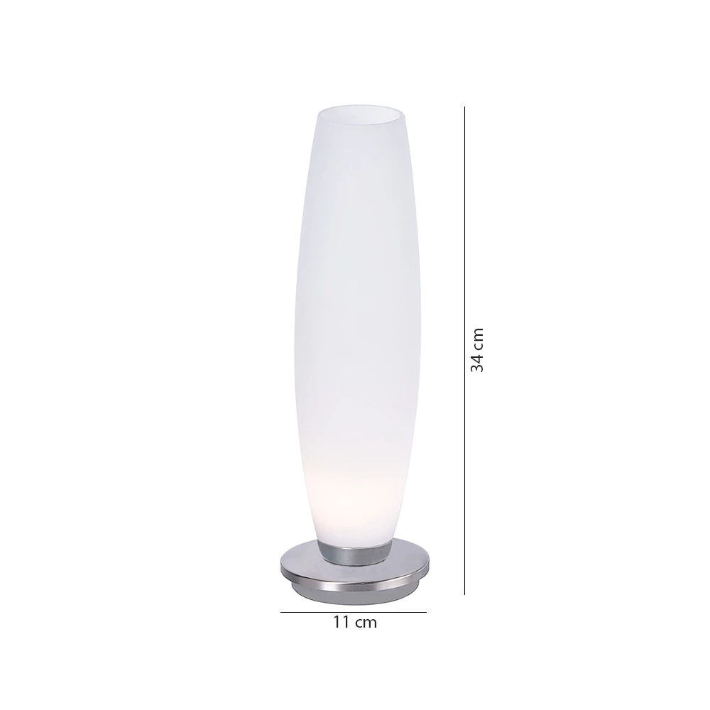 Die LED Leuchte ist mit einem 3-Stufen Touchdimmer versehen, womit sie in drei Stufen dimmbar ist. Die Kombination aus Stahl und matt, weißen Opalglas erzeugt das charakteristische Design dieser Tischleuchte. Die Tischleuchte hat einen Durchmesser von 11 cm und eine Höhe von 33 cm.