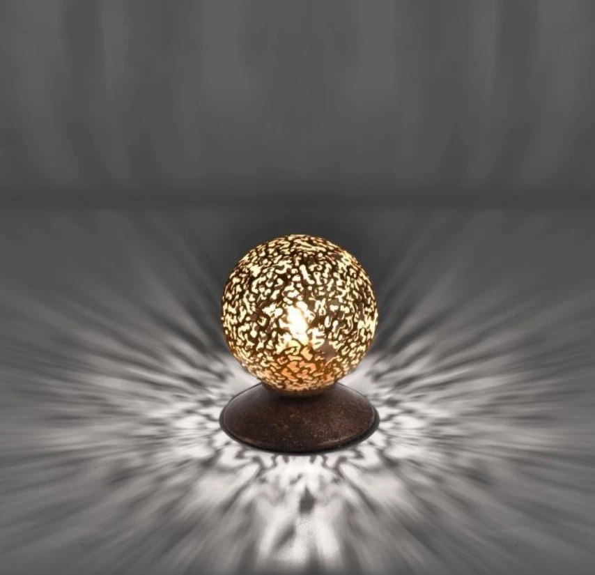 Durch die Kombination aus einer goldenen Leuchtkugel mit lichtdurchlässigem Muster und dem braun lackierten Stahl erhält diese Tischleuchte ihren besonderen Charme.