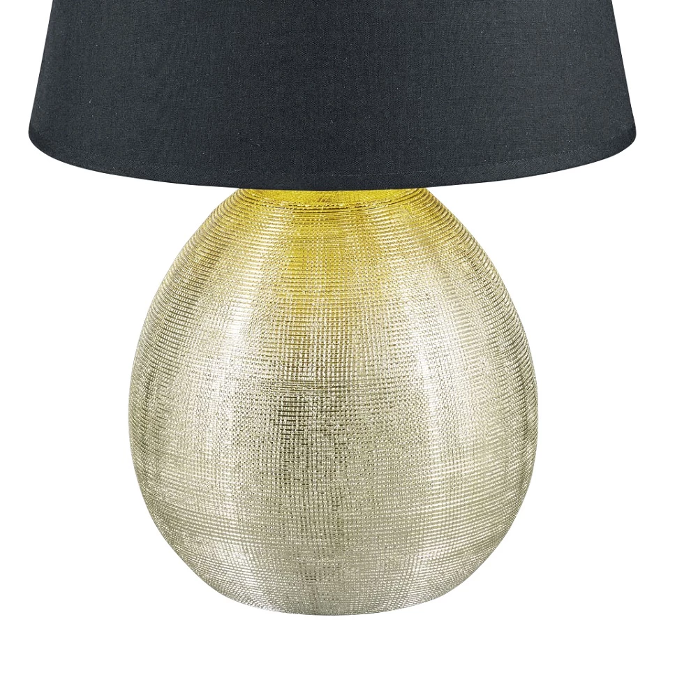 Die edle Tischleuchte hat einen vasenförmigen Fuß aus Keramik. Die Oberfläche des Vasenfußes hat eine goldfarbene Oberfläche mit leichter Struktur. Hinzu wurde ein schwarzer Kunststoffschirm mit golderner Innenfläche kombiniert.