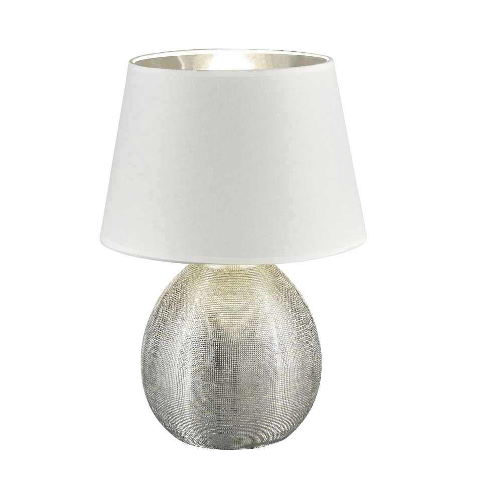 Die edle Tischleuchte hat einen vasenförmigen Fuß aus Keramik. Die Oberfläche des Vasenfußes hat eine silberfarbene Oberfläche mit leichter Struktur. Hinzu wurde ein weißer Kunststoffschirm mit silberner Innenfläche kombiniert.