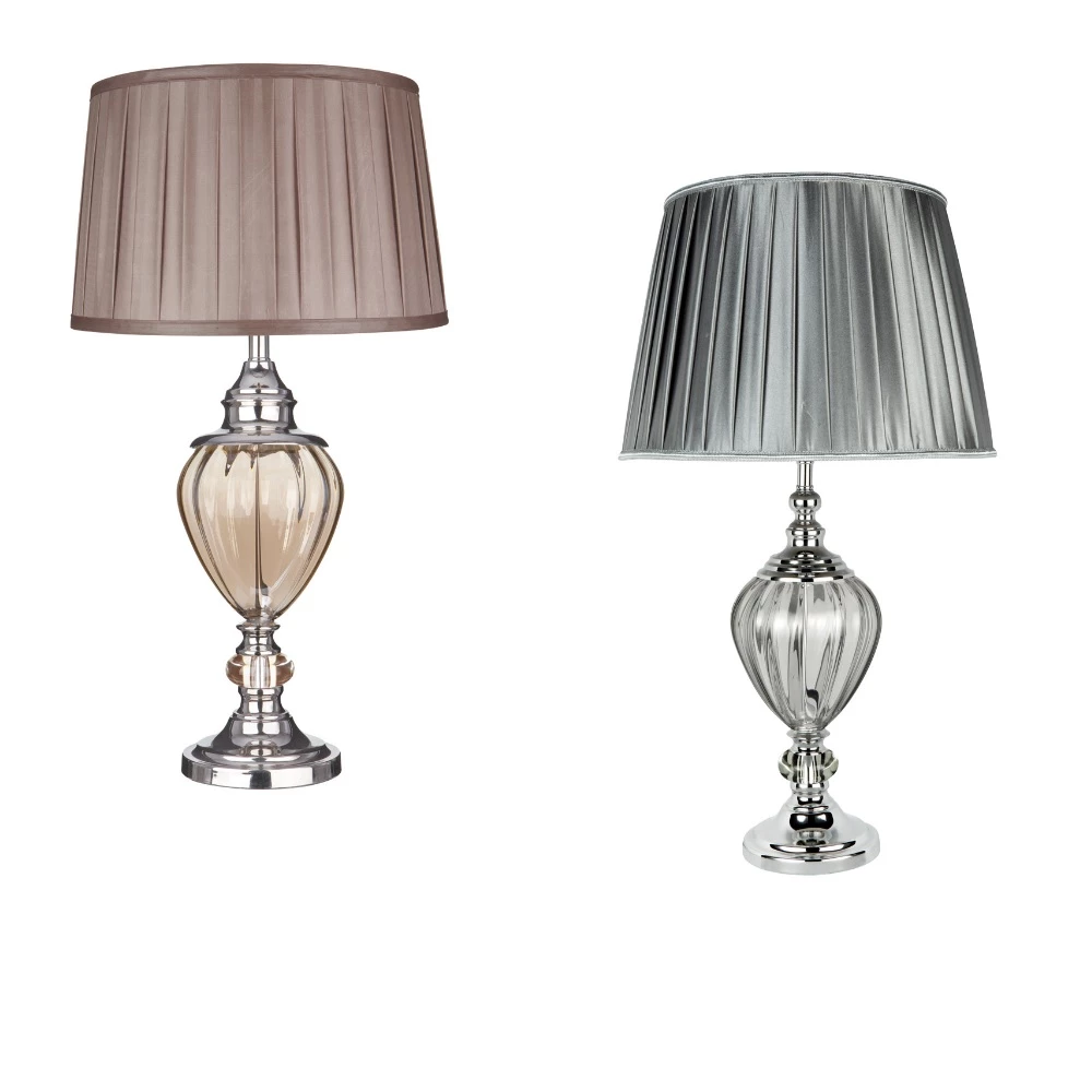 Klassische Tischleuchte mit bauchigem Glaskörper und edlem Lampenschirm aus Plissee-Stoff