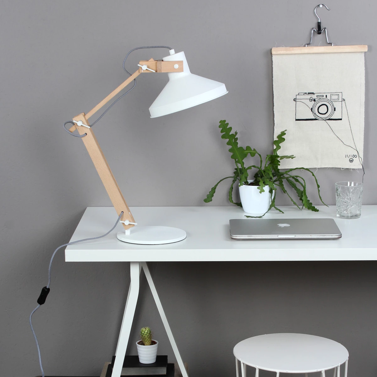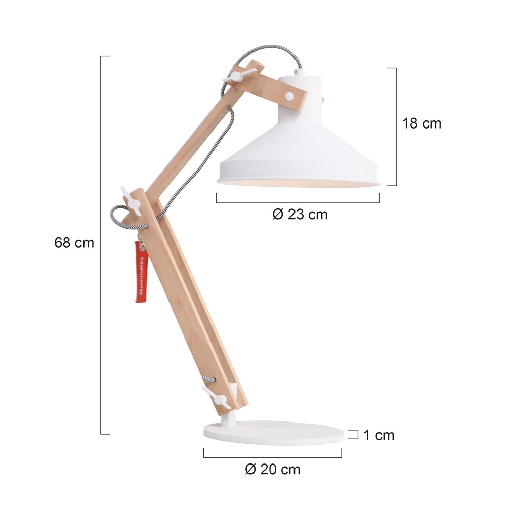 Tischlampe / Schreibtischlampe aus Holz mit weißem Schirm. Das Holz und die weiße Farbe sorgen für die perfekte ländliche und skandinavische Atmosphäre in Ihrem Zuhause. Hat eine schwarz-weiße Schnur von 186 Zentimetern.