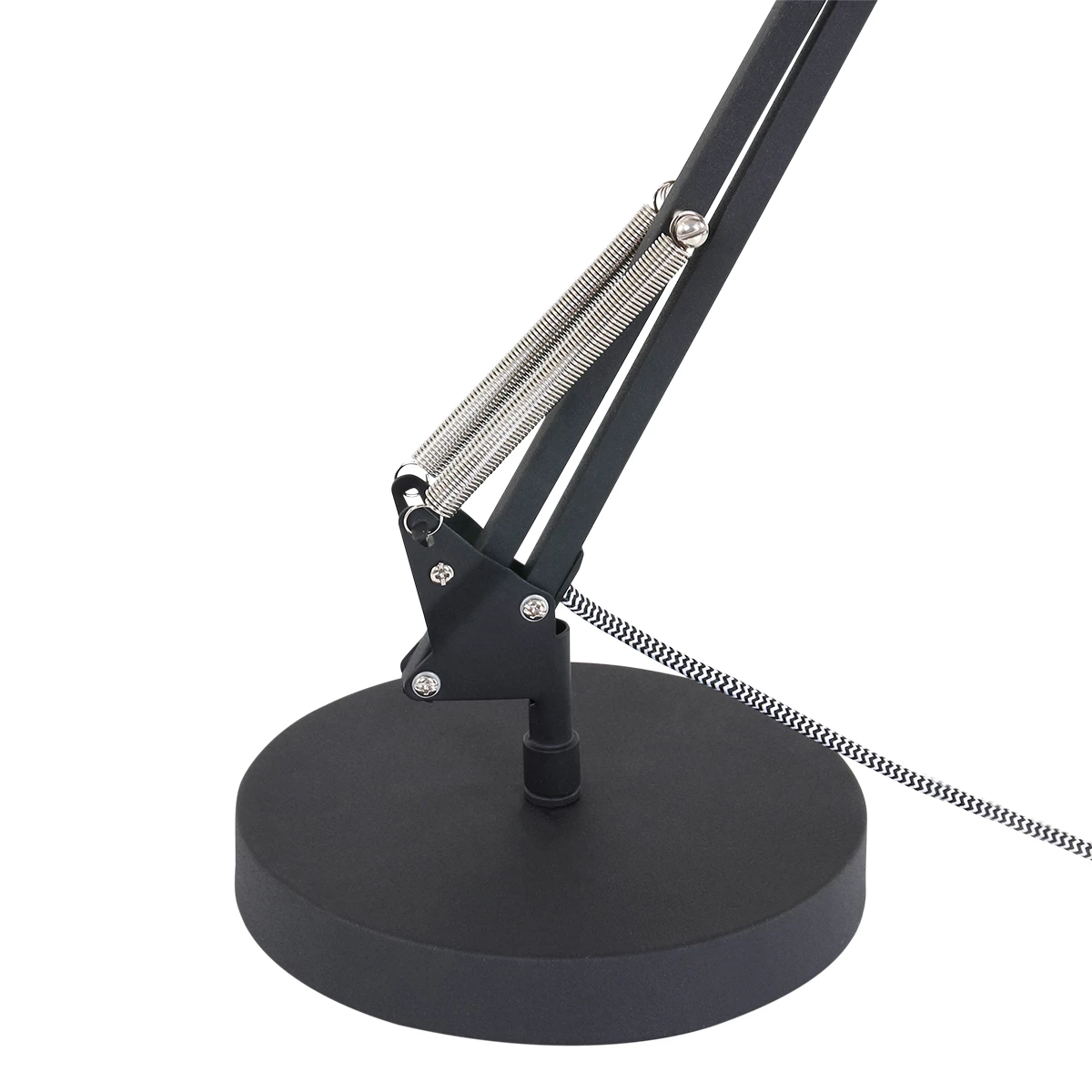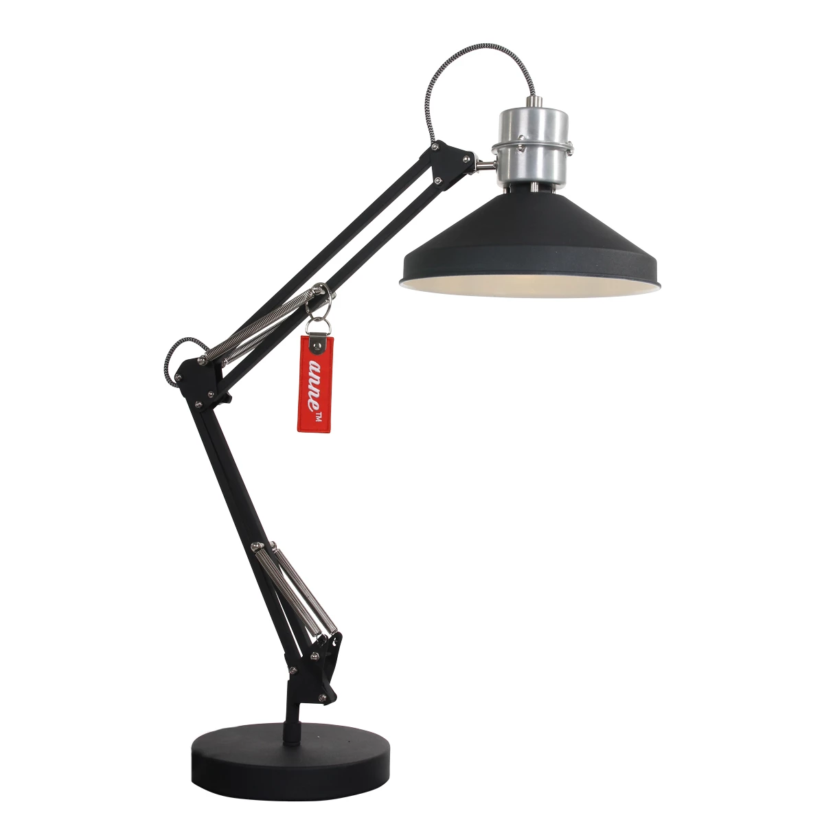 Die Lampe besteht aus schwarzem Metall mit einem Aluminiumaufsatz. Die Tischlampe ist höhenverstellbar von 35 cm bis maximal 80 cm. Die Kipphaube hat einen Durchmesser von 18 cm. Auf diese Weise lässt sich das Licht leicht einstellen.