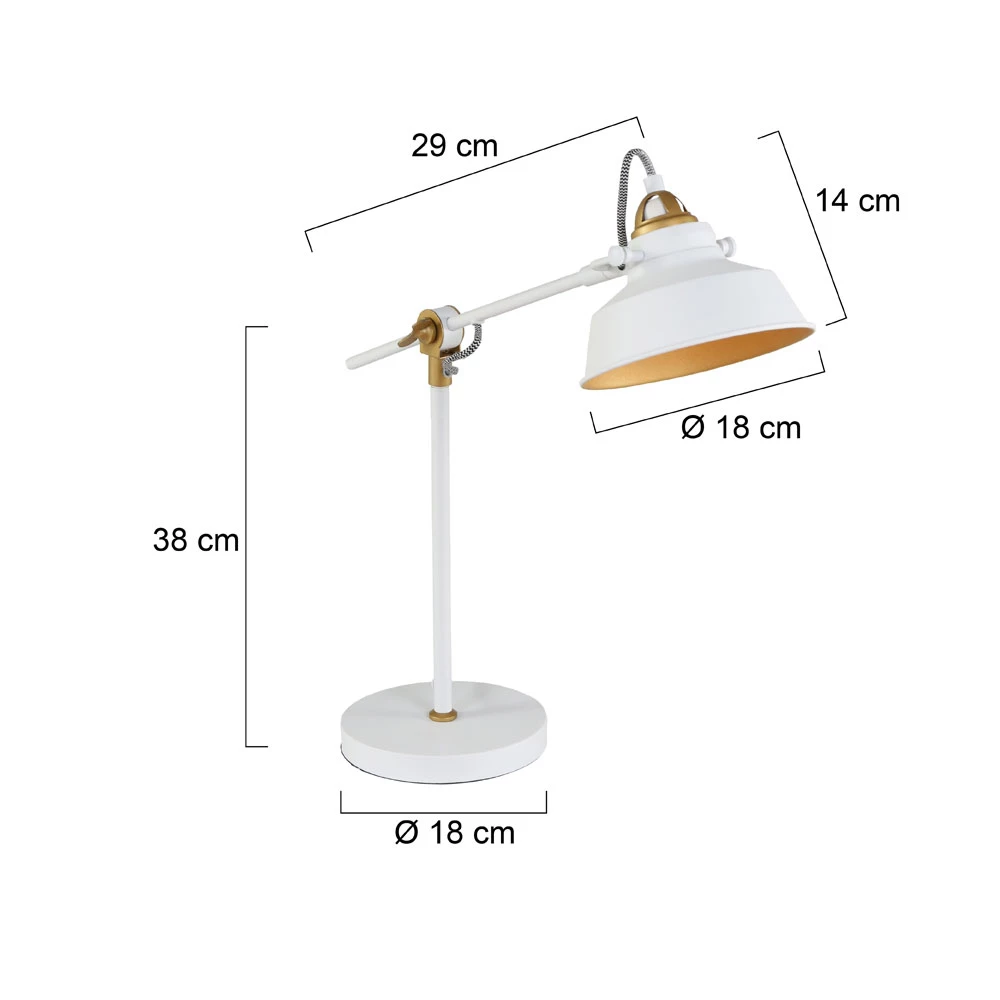 Die schwenkbare Tischleuchte wurde aus hochwertigen Materialien gefertigt, einzelne Elemente wie die kleinen Flügelschrauben sind perfekt gewählt und unterstützen die Funktionalität und die Originalität der Leuchte. Die Farbkombination gold/ weiß und der goldene Innenraum des Metallschirmes macht sie zu einer edlen Leuchte, das textile, schwarz weiß gemusterte Kabel, rundet das Gesamtbild ab. Mit einer Gesamthöhe von 67 Zentimeter ist sie recht stattlich, der runde Leuchtenfuß (18cm) garantiert jedoch beste Standsicherheit. Der Schirm hat einen Durchmesser von 18 Zentimetern.