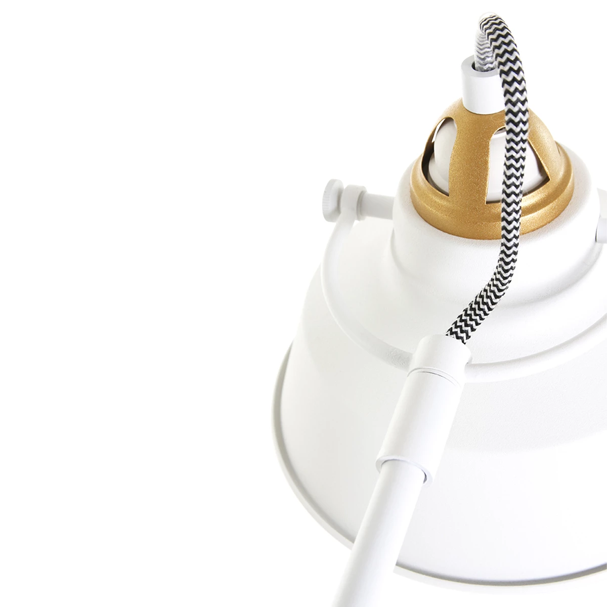 Durch die Kombination von Weiß mit goldenen Details kommen Industrie und Moderne gut zusammen. So passt die stabile Leuchte perfekt in Räume, die im modernen Landhausstil eingerichtet wurden oder skandinavischen Flair ausstrahlen sollen.