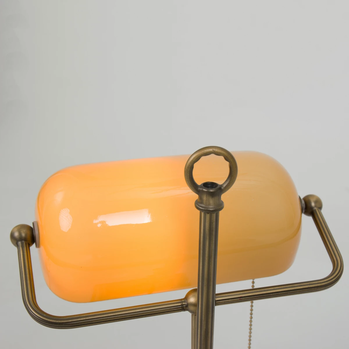 Ein zeitloses Modell aus bronzefarbenem Metall und orangefarbenem Glas. Das Glas ist kippbar. Ausgestattet mit einer E27-Armatur (maximal 60 Watt). Geeignet für LED, Energiespar und Glühbirnen. Die Schreibtischlampe kann per Zugschalter bedient werden.