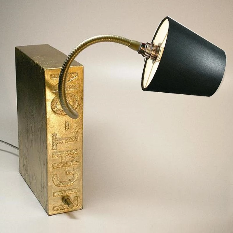Schwere Regalleuchte und Buchstütze, individuell zusammenstellbar mit verschiedenen Leuchtenköpfen. Die verschiedenen Korpusvarianten finden Sie unter dem Reiter verwandte Artikel.