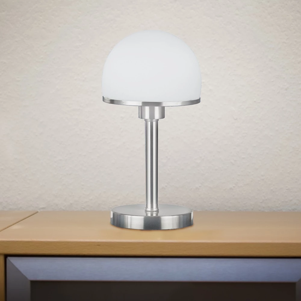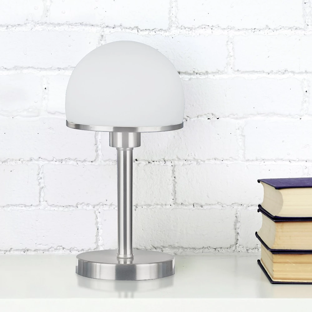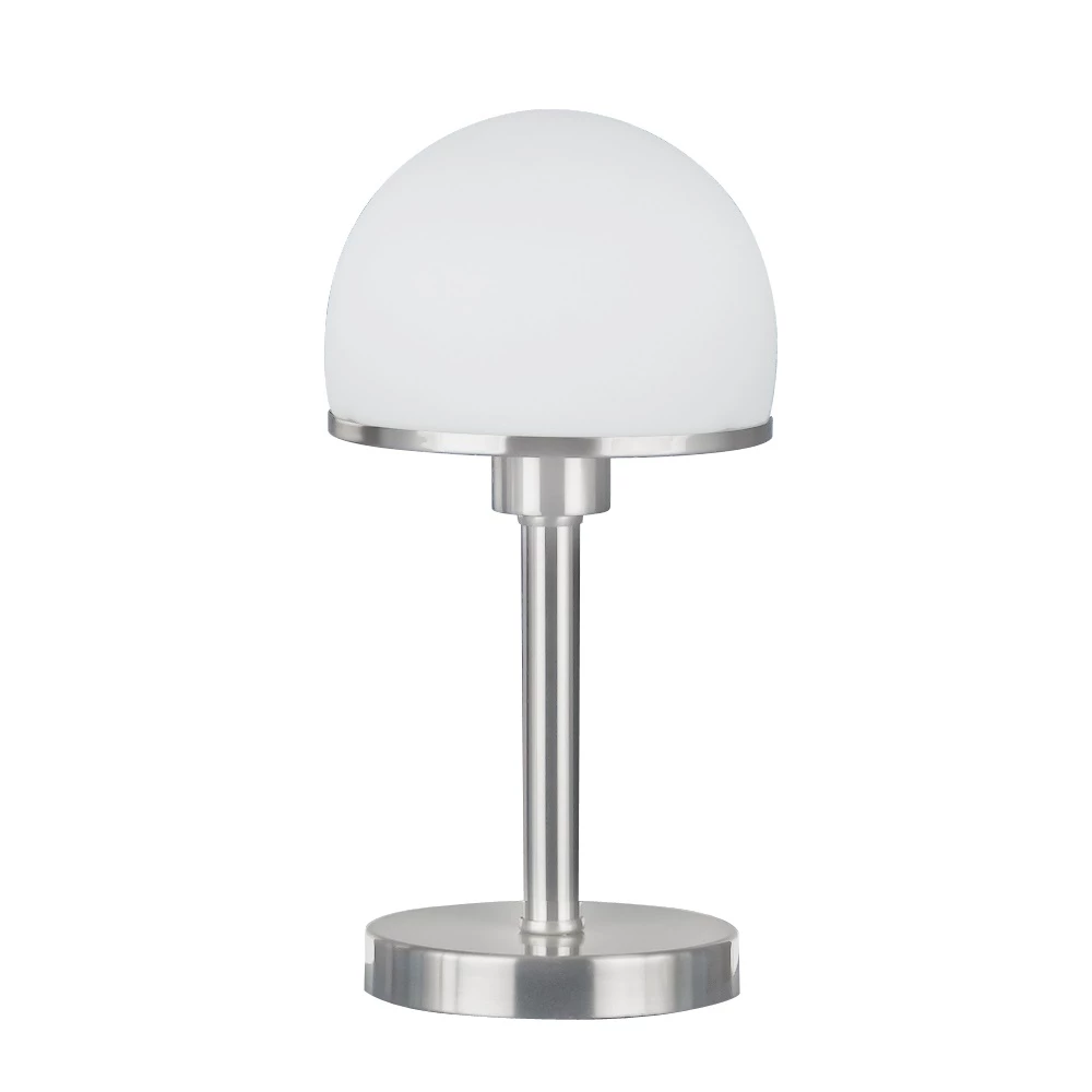 Der Fuß der schicken Tischlampe ist aus Nickel mattem Metall gefertigt. Die dazu kombinierte matt weiße Glaskuppel verhindert den Blick auf das Leuchtmittel.
